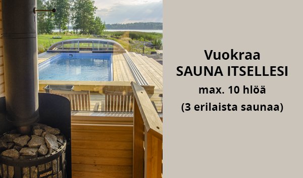 klo 13.00–15.00 Sauna (puusauna) ja uinti uima-altaassa tai meressä sekä kylmäallas. Mahdollista lämmittää kaksi eri saunaa – yksi naisille ja yksi miehille (puu- ja sähkösaunat)