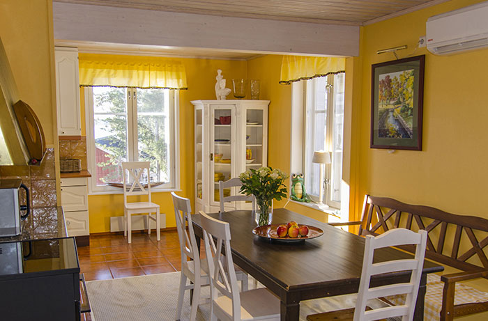 Kotoisaan yhdessäoloon on suuren eteisen ja aulan lisäksi, takka/olohuone, ruokailuhuone, päämakuuhuone, WC, kylpyhyhuone, iso keittiö ja lasitettu terassi. Talossa on kaikki mukavuudet ja se on hyvin varusteltu. Huom! Talossa on portaikkoja, joten se ei sovi liikuntaesteisille.